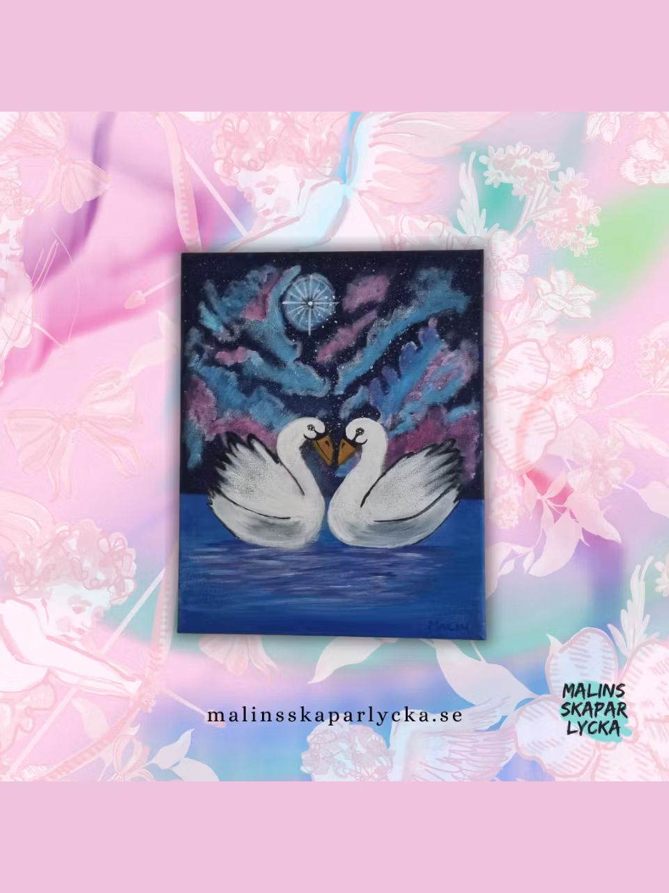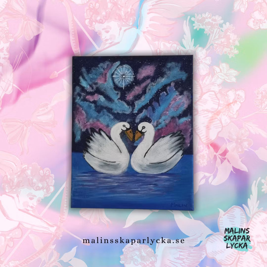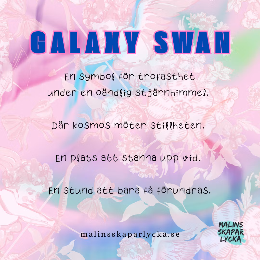 Se svanarna simma omkring på det glittrande vattnet, med en galax himmel som bakgrund.