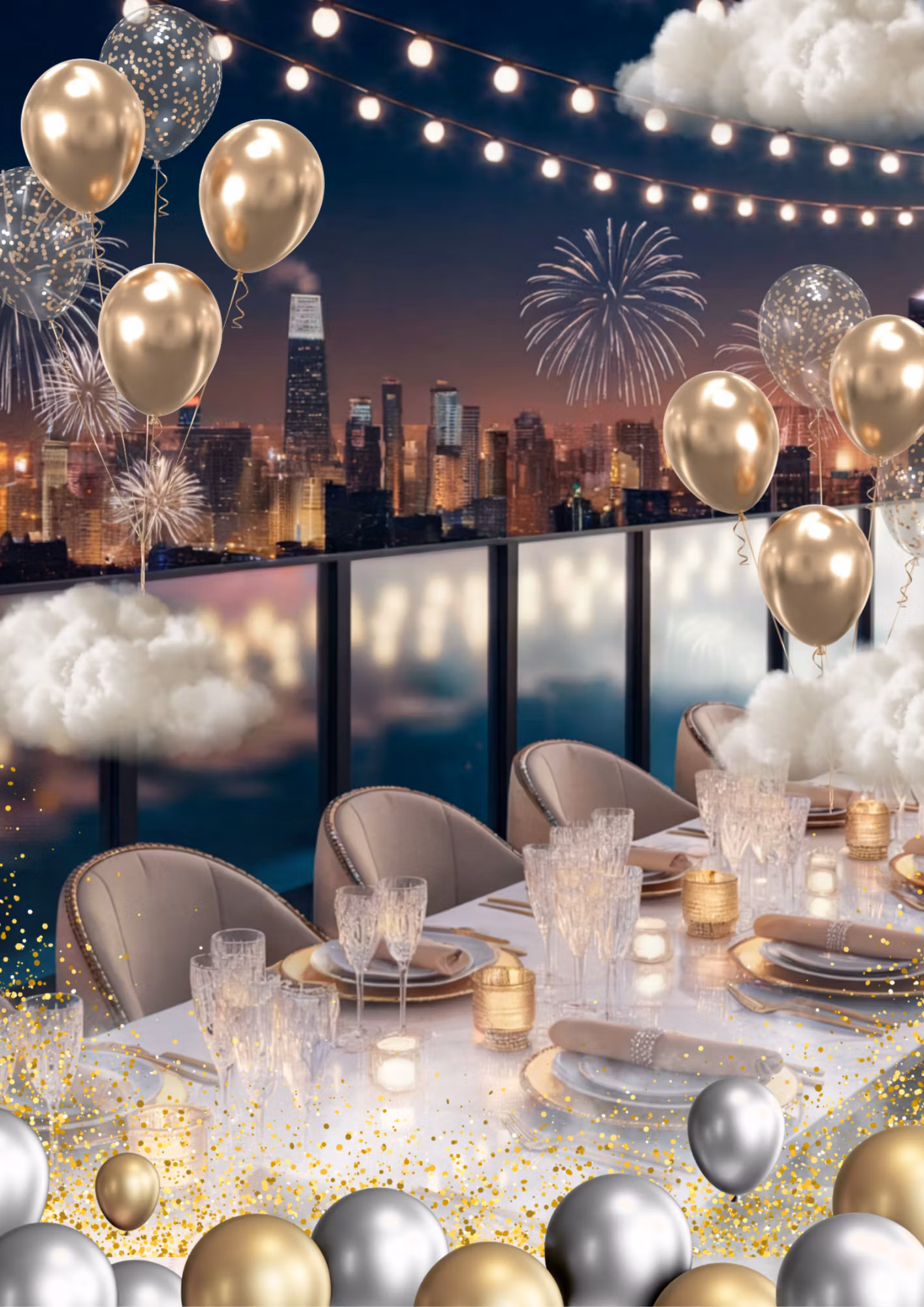 Med guldballonger, fyrverkerier och ett glittrande champagneglas fångar denna hjältinna känslan av en exklusiv nyårsnatt.